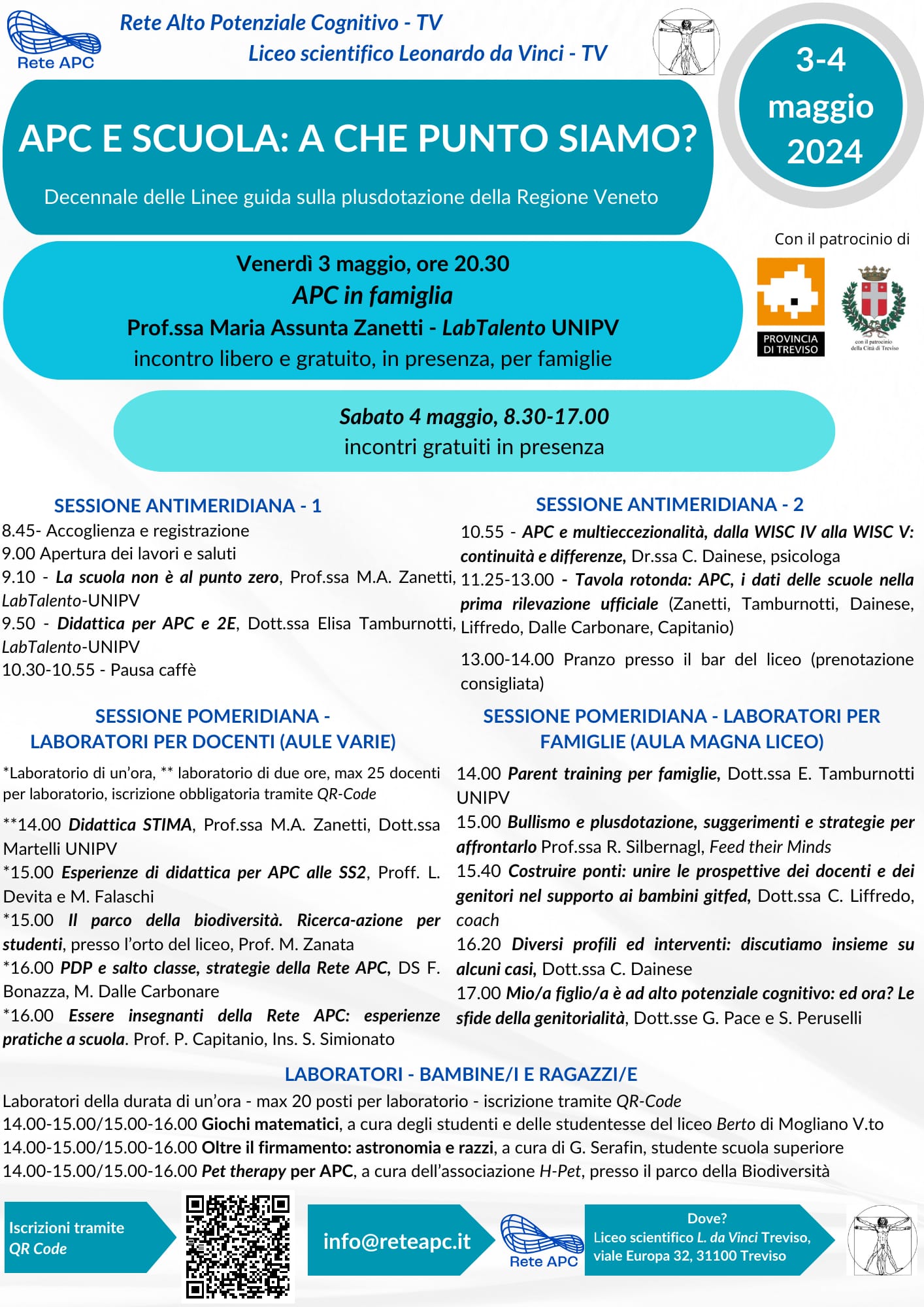 L’evento è organizzato dalla rete APC di Treviso, con il patrocinio della Provincia di Treviso e della Città di Treviso, fa parte di un ciclo di incontri organizzati per celebrare questo importante anniversario ed è successivo all’evento “2014-2024 10 ANNI DI APC” Alto potenziale Cognitivo in Veneto – dalle linee guida all’esperienza sul campo, tenutosi il 3.04.2024 presso lo IUSVE di Mestre (VE).