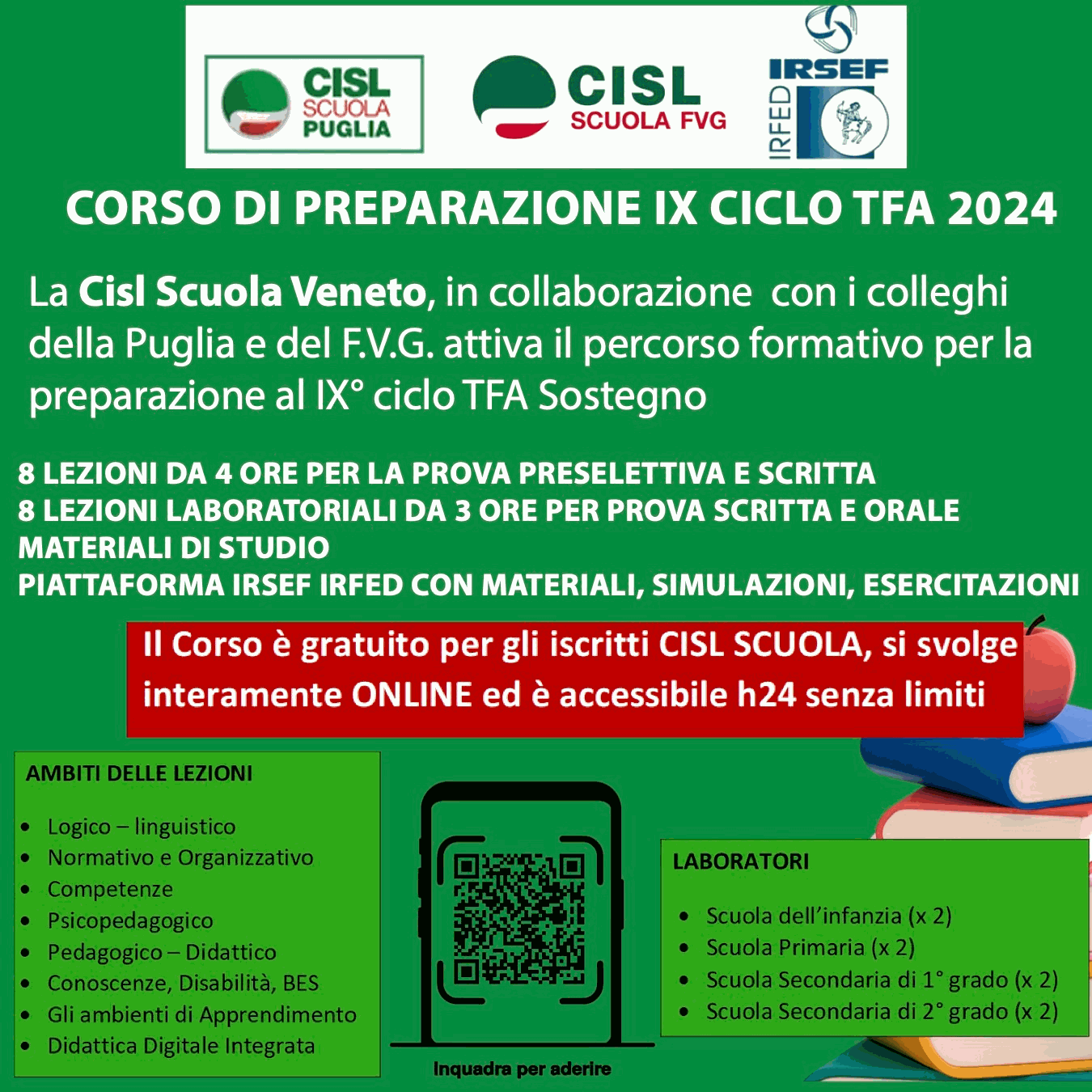 La CISL Scuola Veneto in collaborazione con i colleghi della CISL Scuola Puglia e della CISL Scuola F.V.G., hanno attivato il corso di preparazione al prossimo TFA Sostegno riservato agli iscritti o a chi intende iscriversi.