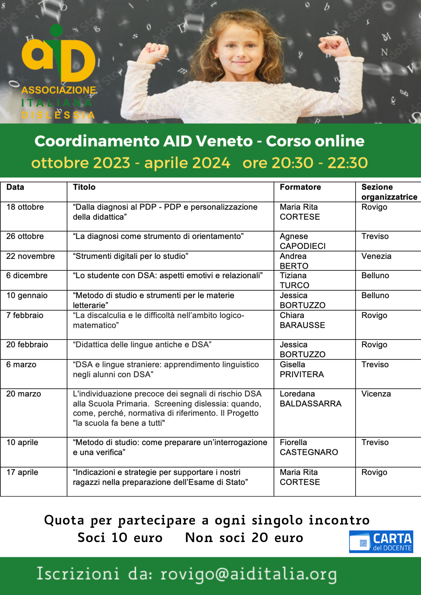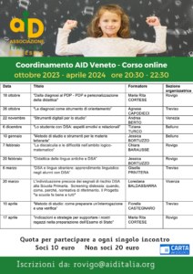 Sono n. 6 incontri, dalle ore 20.45 alle 22.15 – dal 23 ottobre; Iscrizioni a breve dal sito AID Treviso (inviare una e-mail a: Treviso@aiditalia.org). In allegato altri eventi