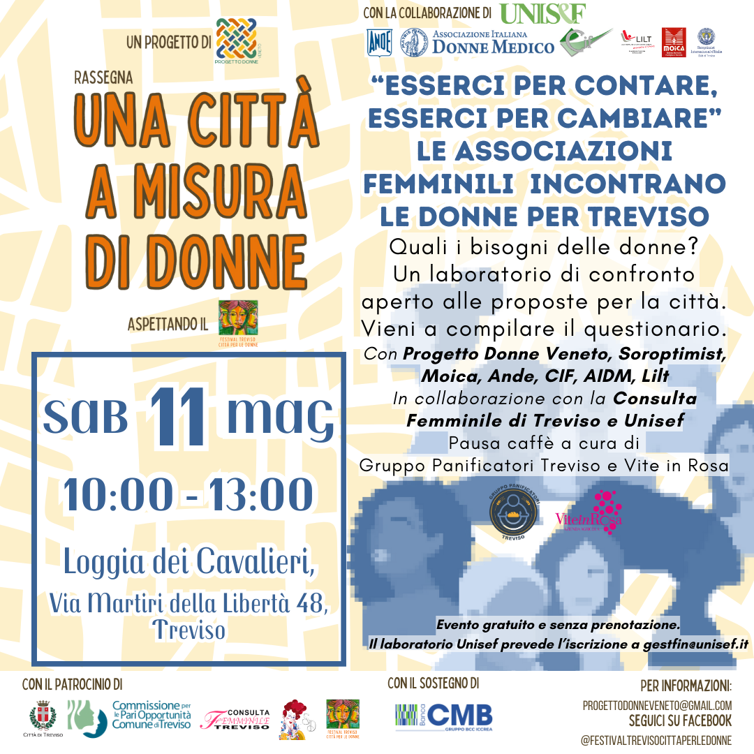 10:00 - ore 10.00-13.00 Loggia dei Cavalieri – Treviso “Esserci per contare, esserci per cambiare” Promosso: Progetto Donne Veneto in collaborazione con la Consulta Femminile e Unisef. Solo per il laboratorio con Unisef è necessaria l’iscrizione a gestfin@unisef.it Gli eventi sono gratuiti Pausa caffè a cura del Gruppo Panificatori Treviso. Info: Progetto Donne Veneto Aps progettodonneveneto@gmail.com