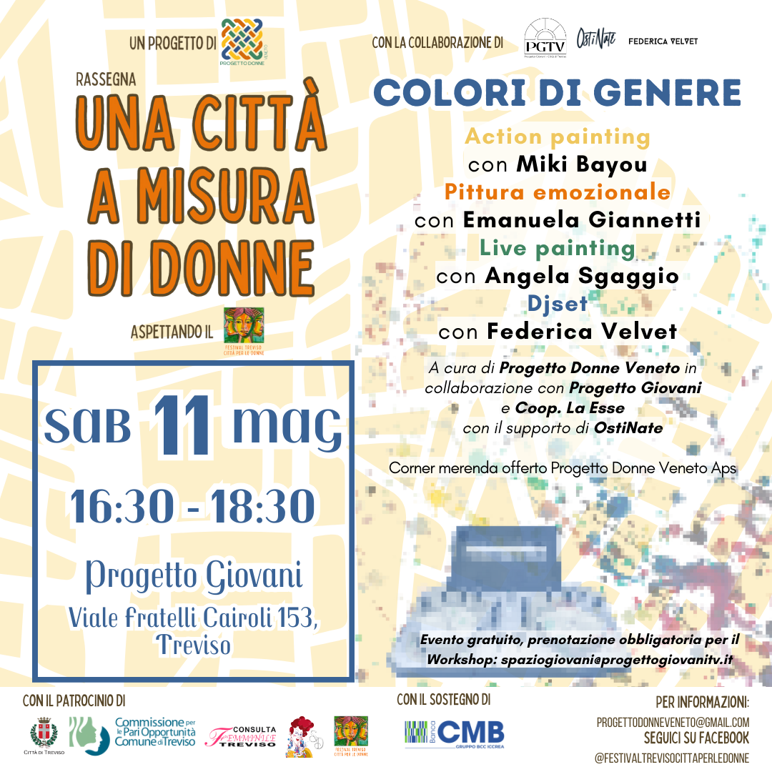 Mag16:30 - Ore 16.30-18.30 – Progetto Giovani V.le F.lli Cairoli 153 “Colori di genere” Tutti gli eventi sono gratuiti, necessaria però la prenotazione per il Workshop scrivendo a spaziogiovani@progettogiovanitv.it Info: Progetto Donne Veneto Ape progettodonneveneto@gmail.com; Progetto Giovani spaziogiovani@progettogiovanitv.it