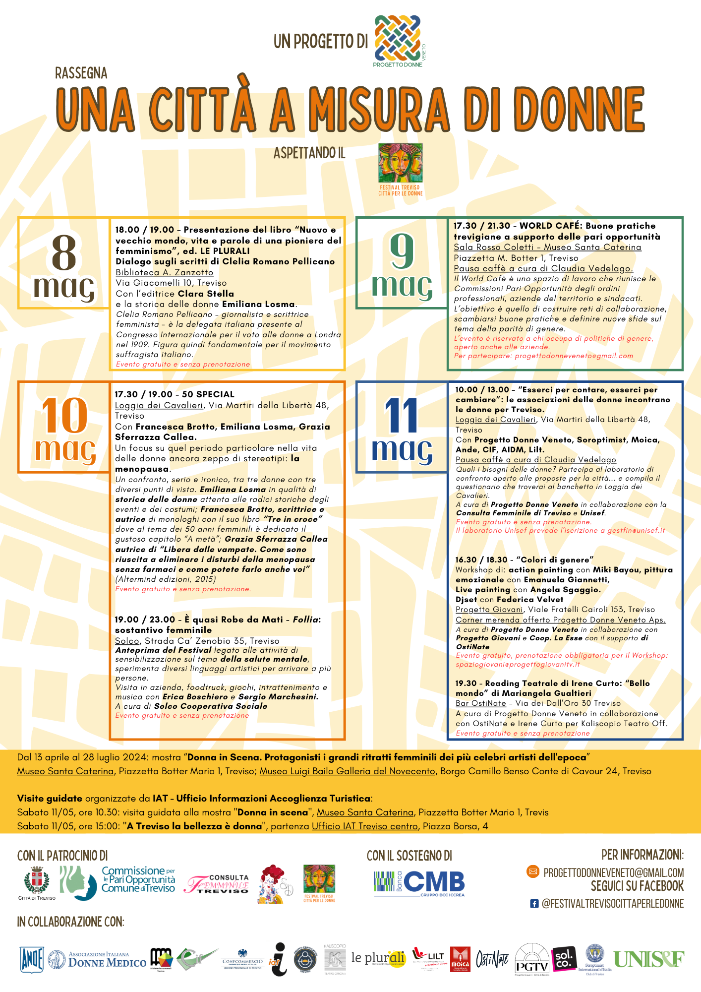 10:30 - Visite guidate a cura di IAT Treviso Alle ore 10.30 visita guidata alla mostra “Donna in scena”, museo Santa Caterina. Costo 10 euro intero, 8 ridotto che comprende la visita guidata più il servizio di audio ricevente. Ingresso alla mostra: 10 euro, gratuito per under 18 e persone con disabilità. Alle ore 15 “A Treviso la bellezza è donna”, tour in città per scoprire i luoghi delle donne importanti che vissero a Treviso. Costo: 8 euro intero e 6 ridotto, direttamente prima della partenza dagli uffici IAT.