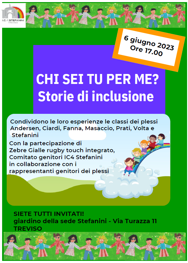 Si prevede a fine anno di dare visibilità a qualche percorso (su base volontaria) in un momento dedicato all’inclusione, dove i protagonisti (bambini e ragazzi) potranno raccontarsi. Foto, scritti, poesie, performance, attività espressive, ricerche interdisciplinari, costruzione di materiali, attività laboratoriali di vario genere sono esempi di come si possa affrontare la tematica nel rispetto dell’età e degli interessi degli alunni coinvolti.